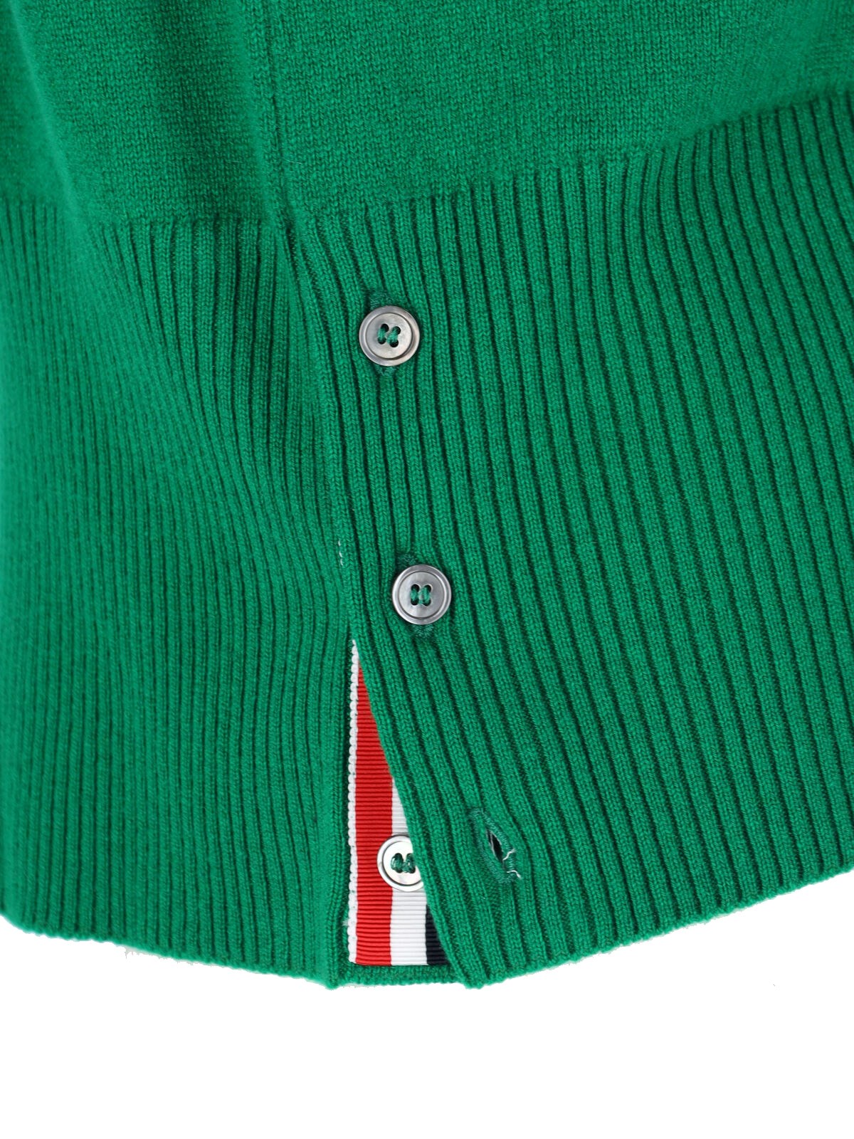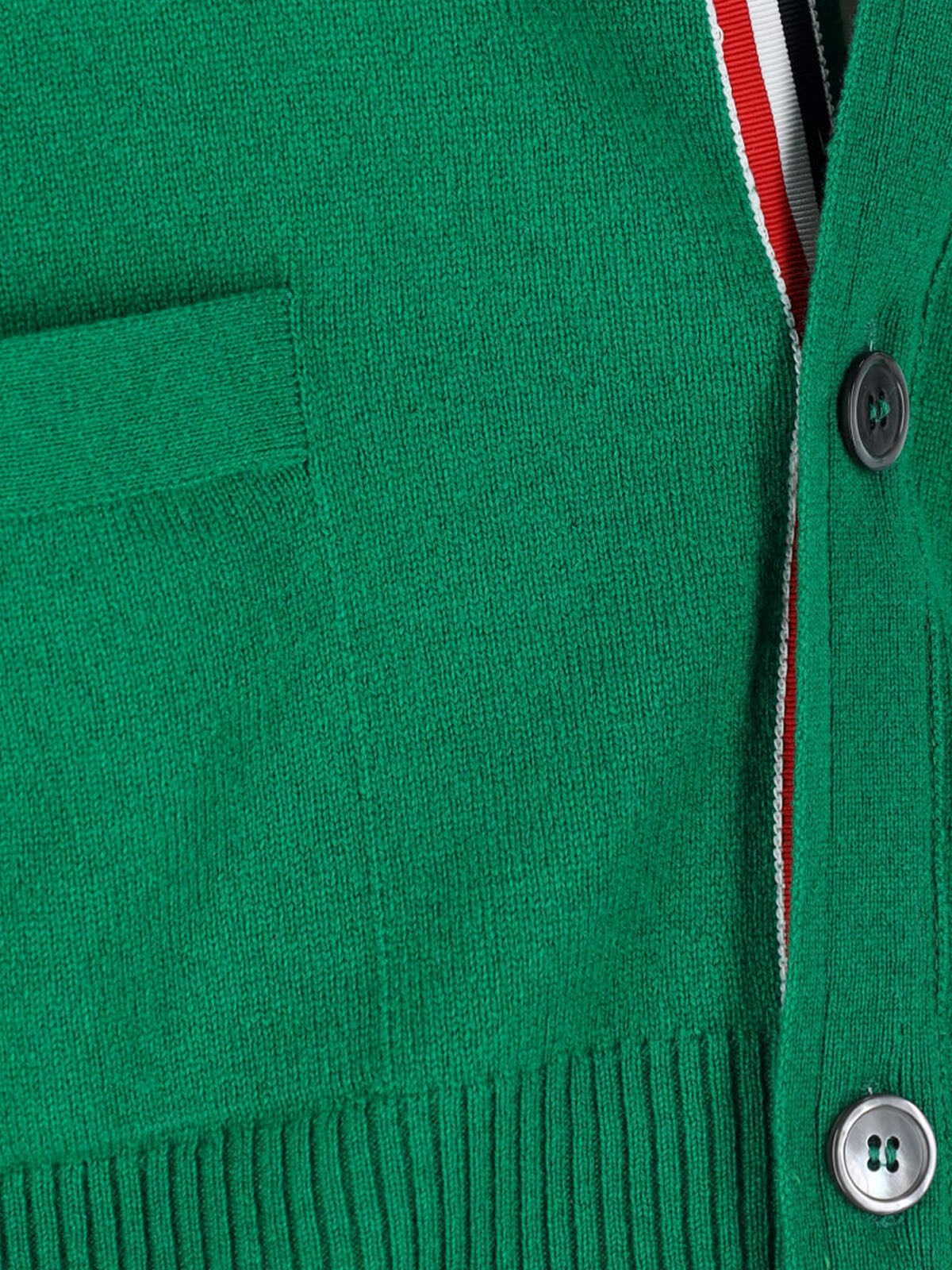 Cardigan '4 Bar' by Thom Browne in green cashmere, V-neck, button closure, long sleeves, two front pockets, '4 Bar' detail on the sleeve, ribbed finishes, straight hem.