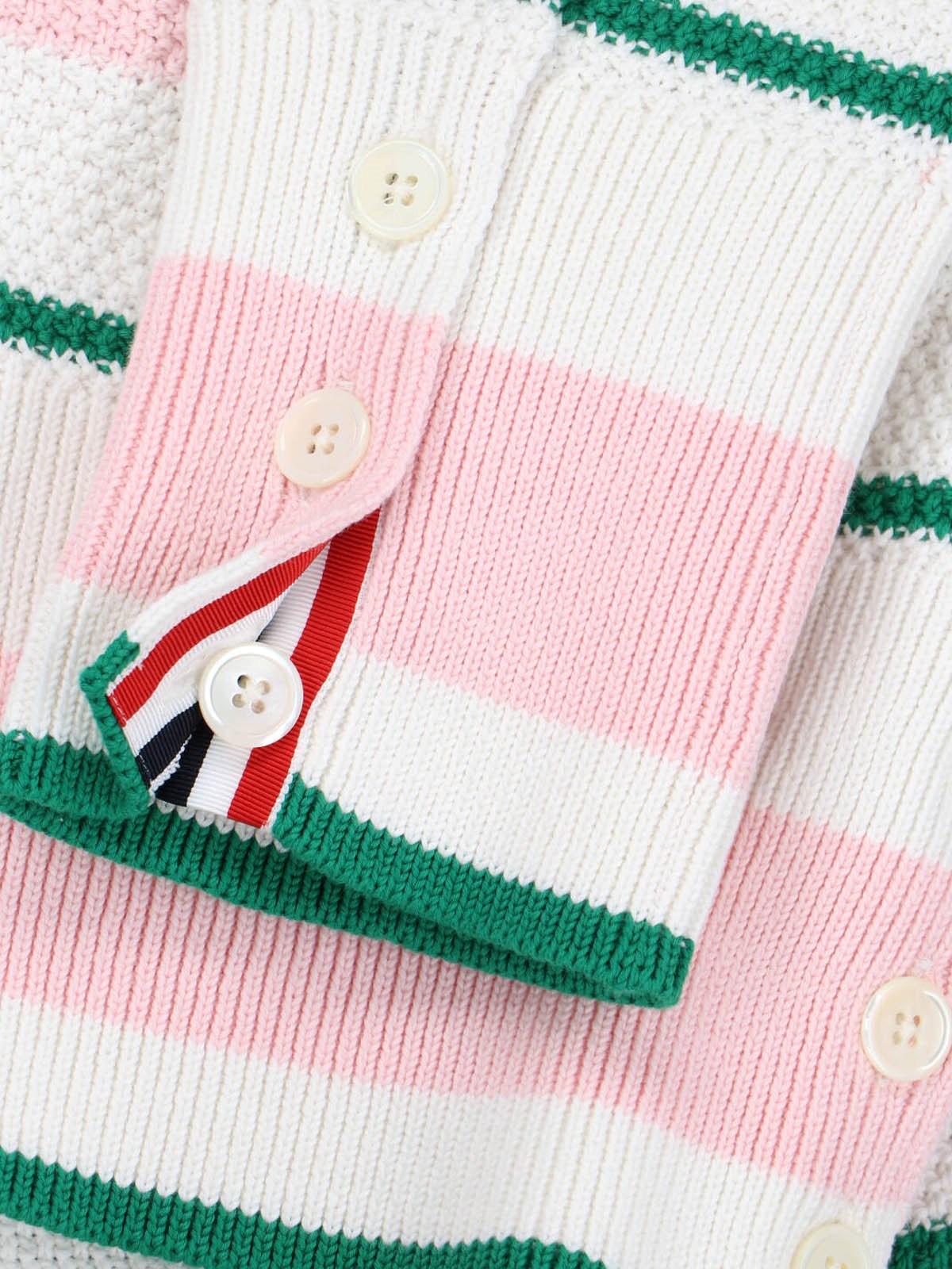 Thom Browne striped cardigan in pink cotton, V-neck, long sleeves, button closure, two front pockets, straight hem.
