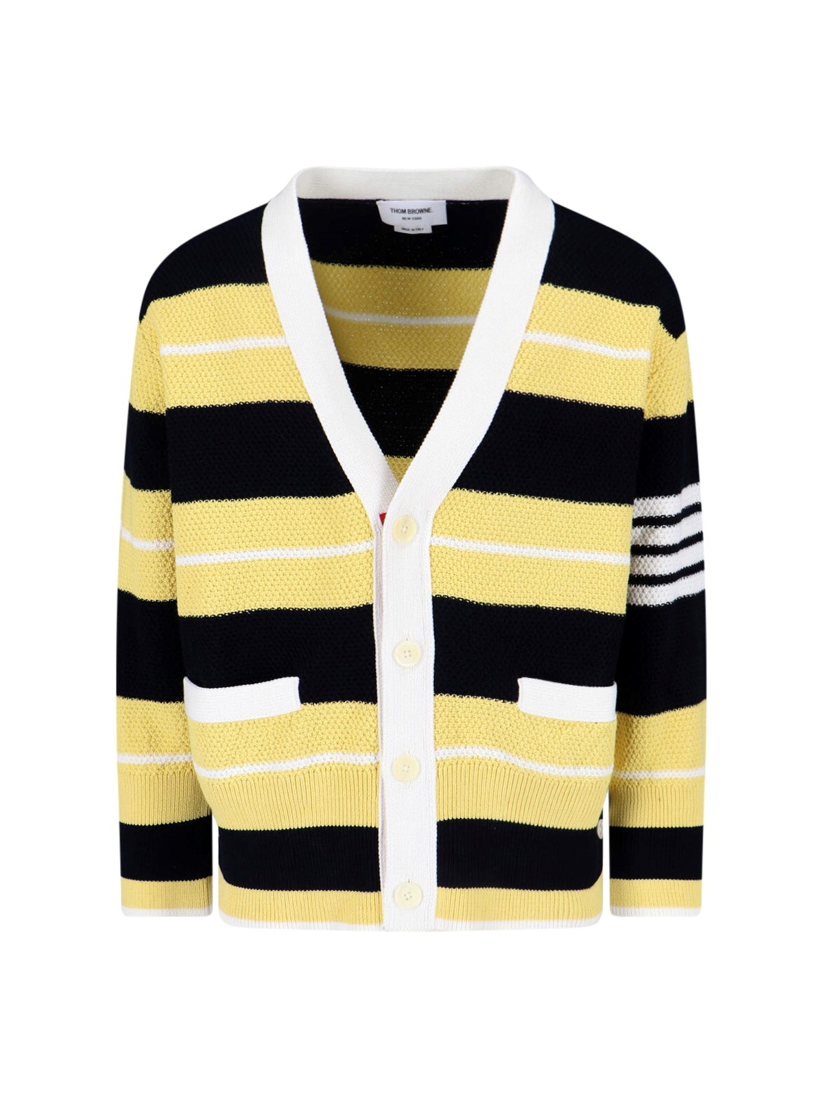 Thom Browne striped cardigan in yellow cotton, V-neck, long sleeves, button closure, two front pockets, straight hem.