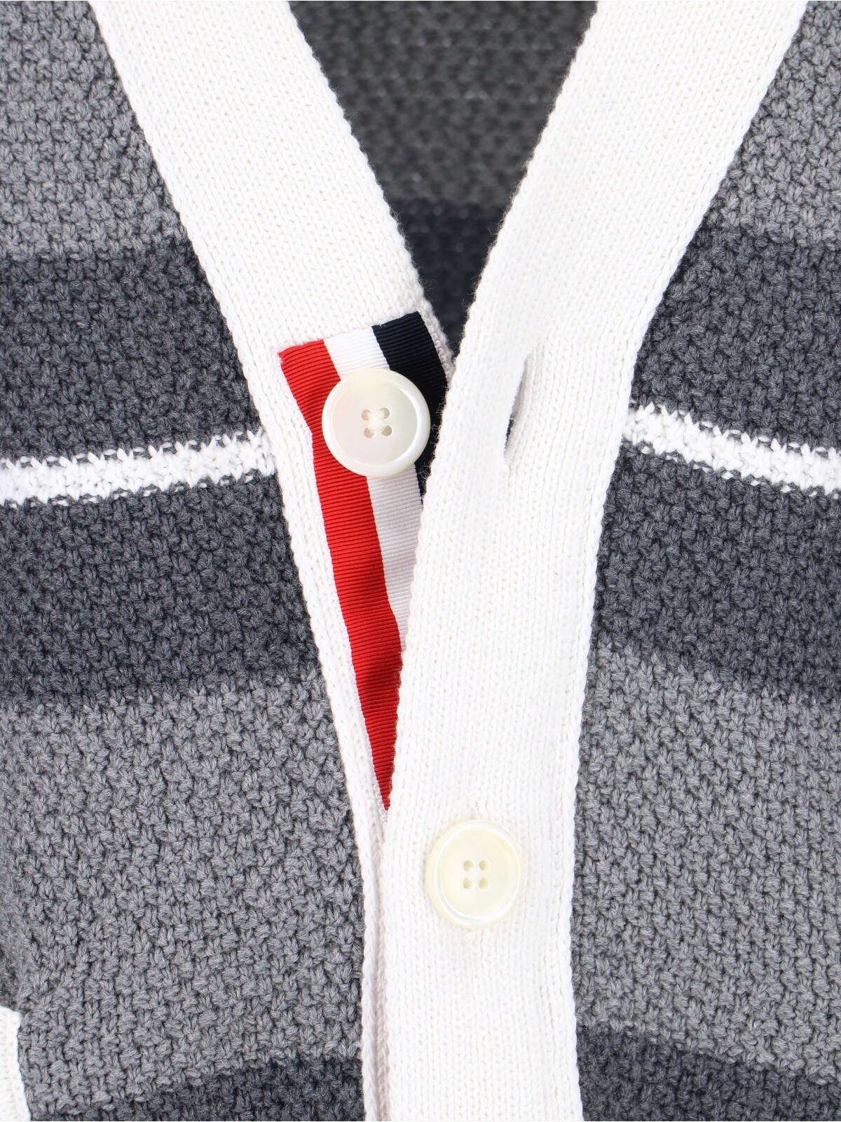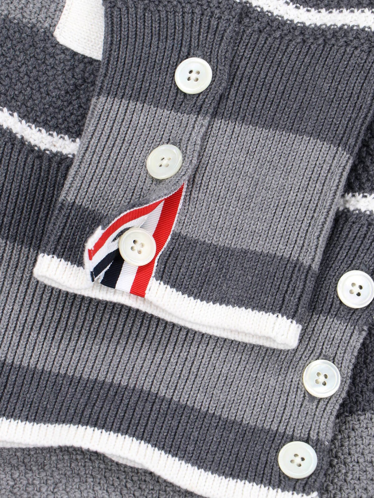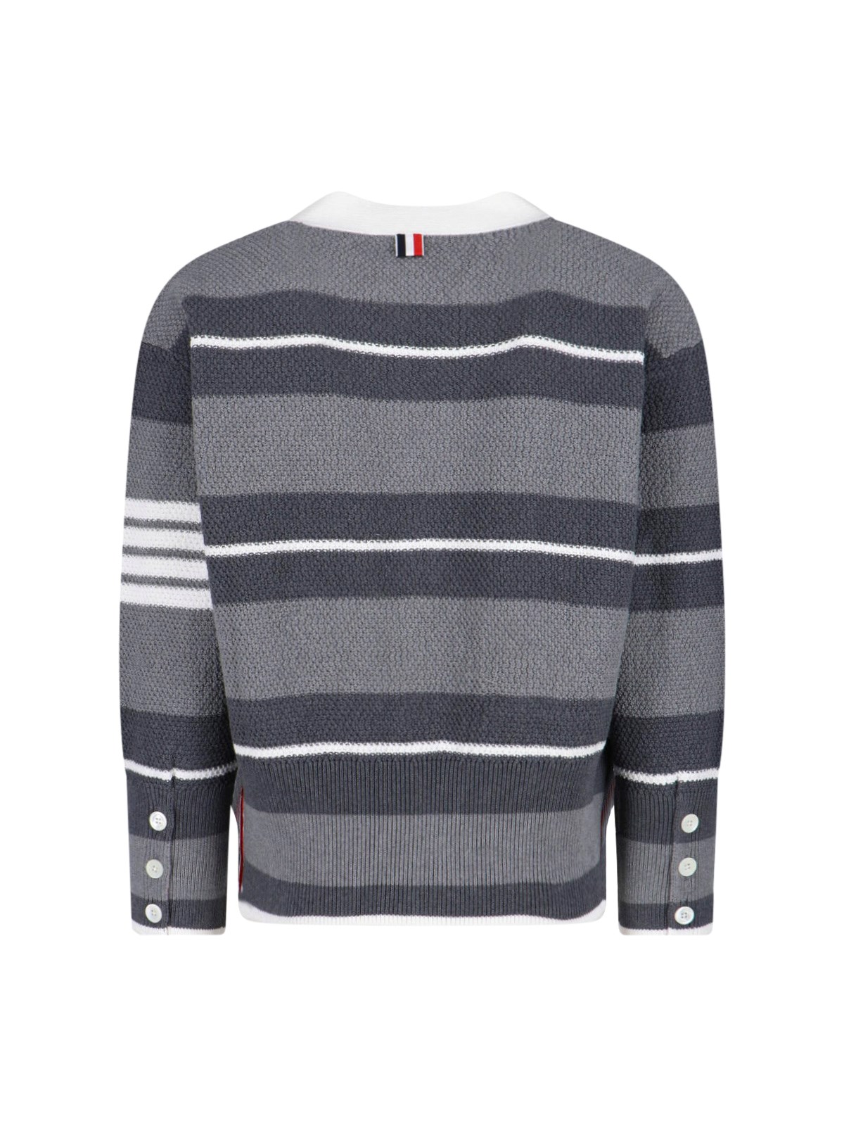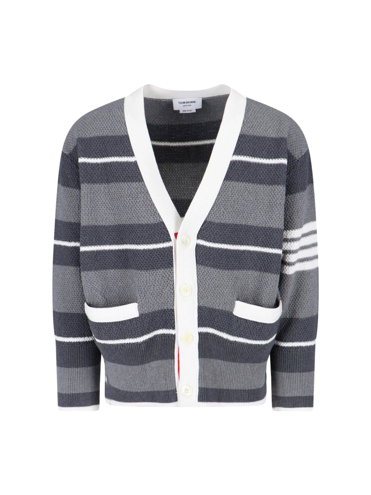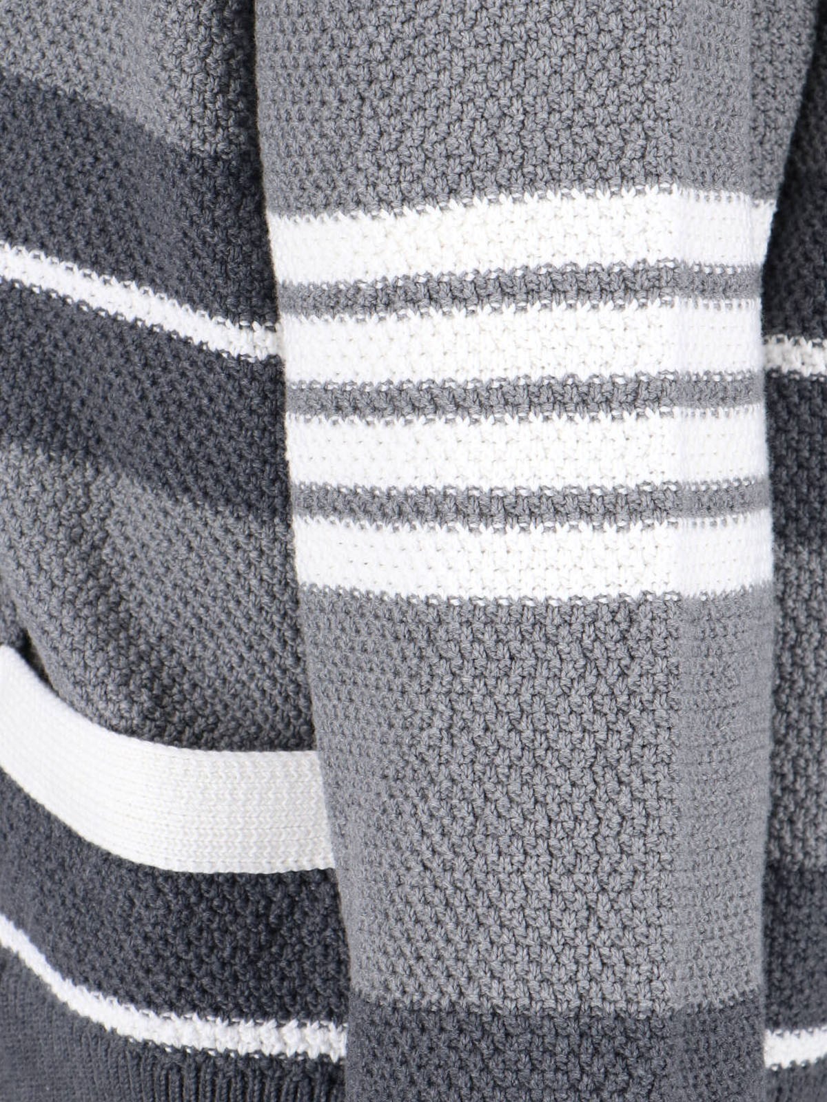 Thom Browne striped cardigan in gray cotton, V-neck, long sleeves, button closure, two front pockets, straight hem.