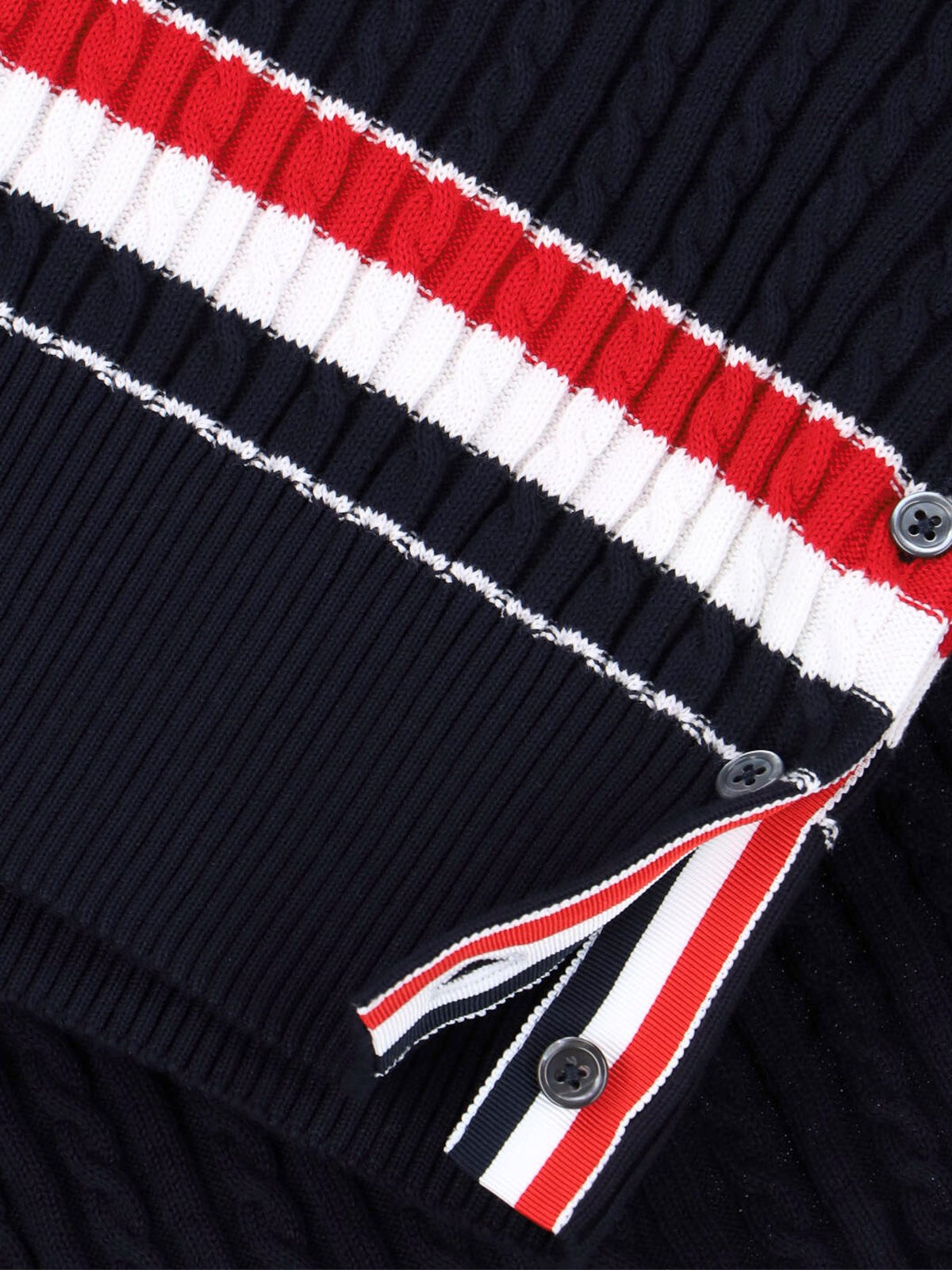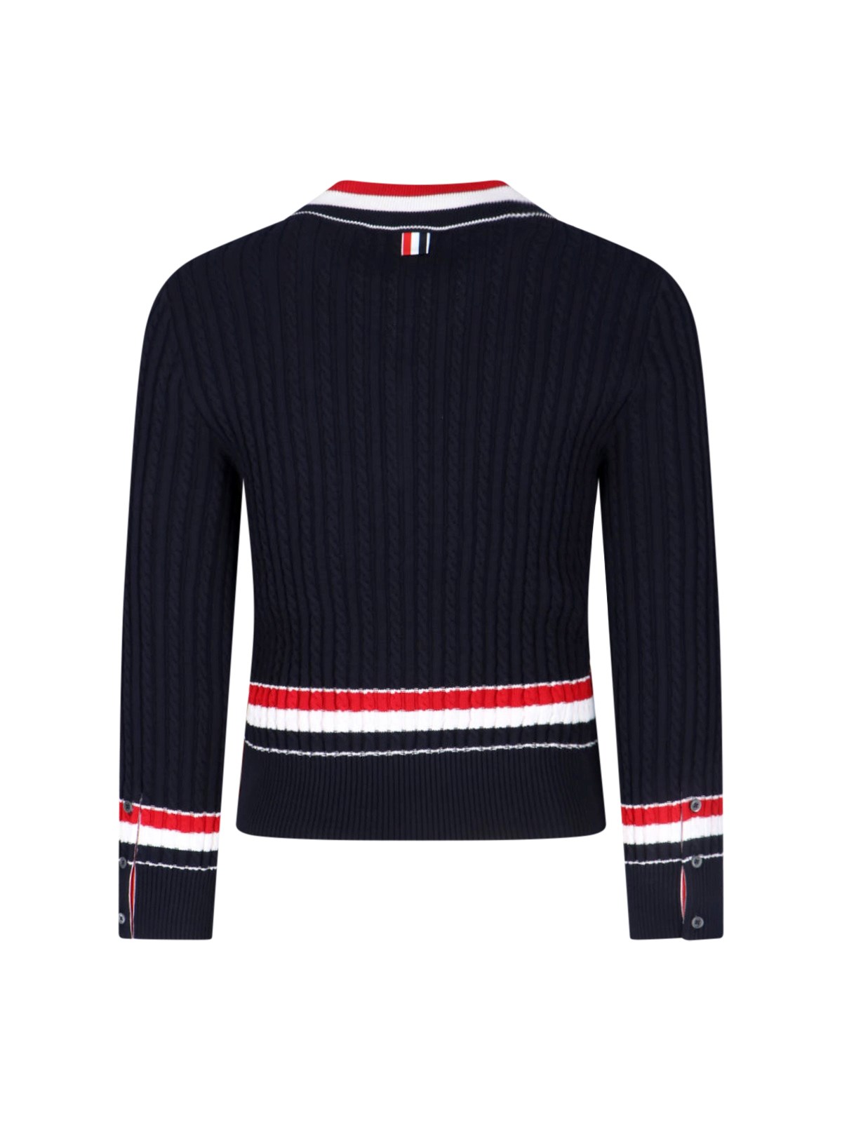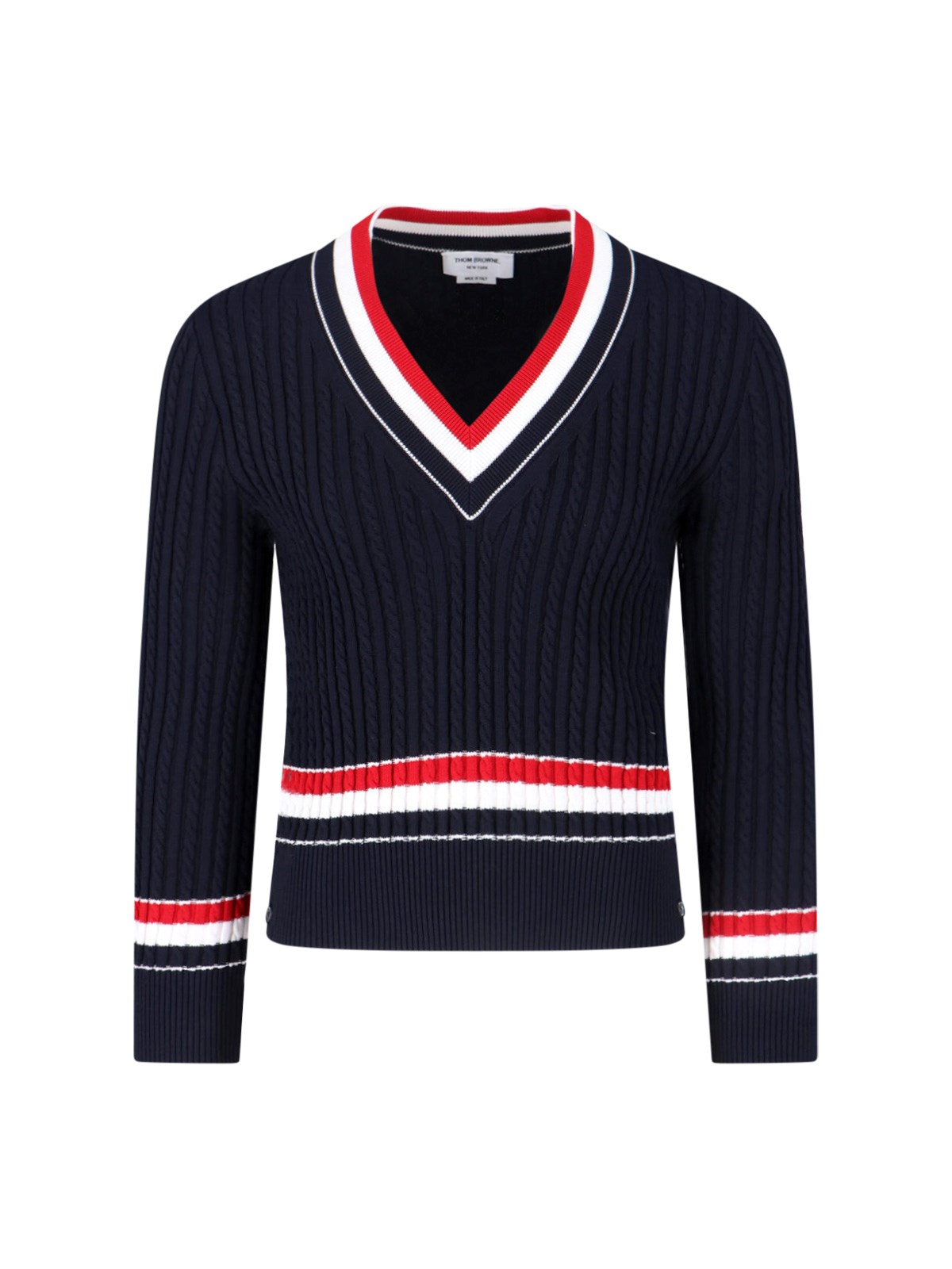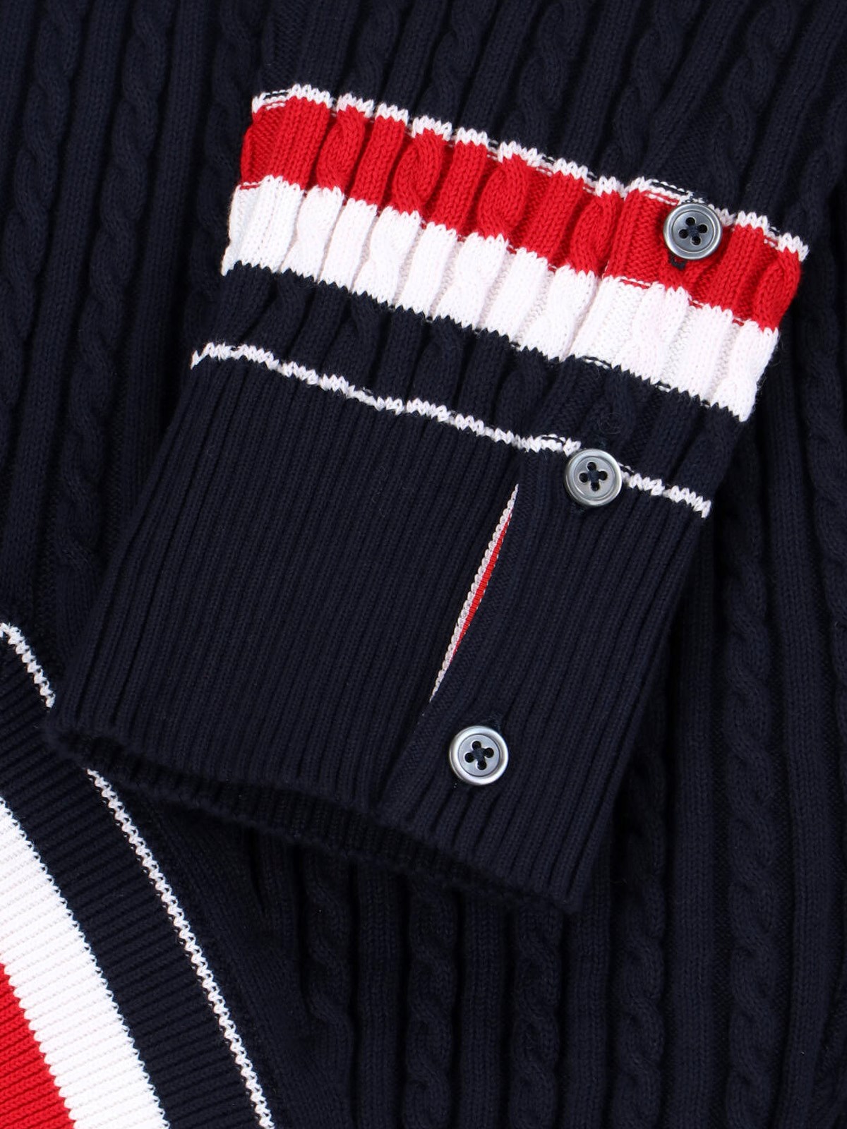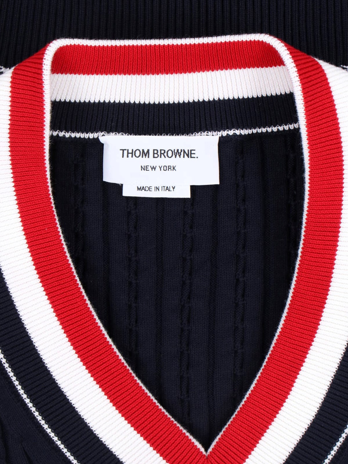 Thom Browne cotton sweater, blue, navy shade, ribbed pattern, V-neck, long sleeves, contrasting finishes.